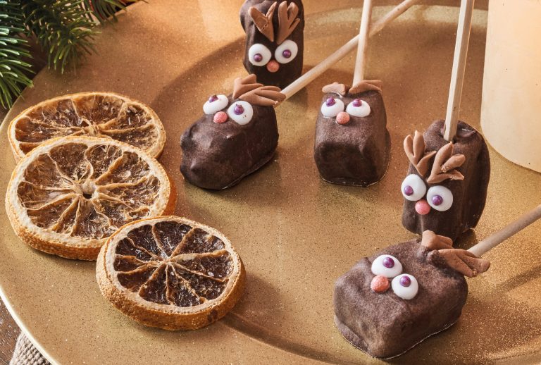 4/ Coupez-le chocolat en petit morceau et faites-le fondre. Une fois fondu, plongez-y entièrement les pâtes de fruits et déposez-les sur une feuille de papier sulfurisé. Il ne vous reste plus qu’à ajouter les yeux, la bille de sucre pour le nez et enfin les bois de cerfs.